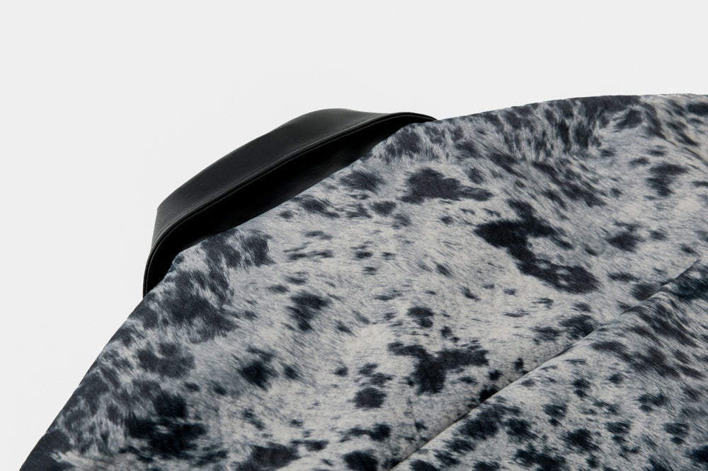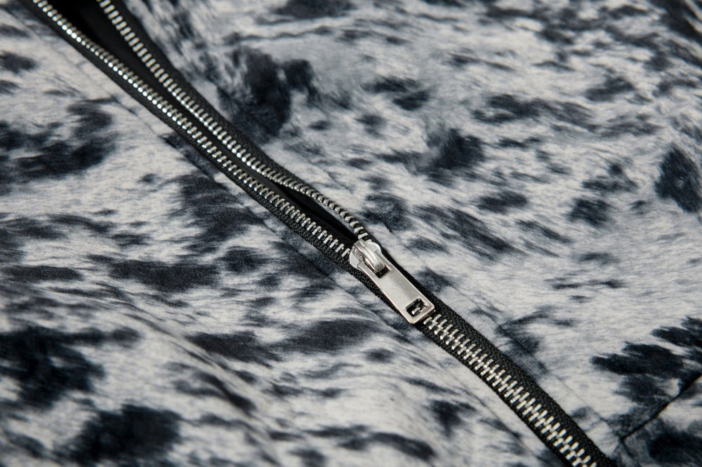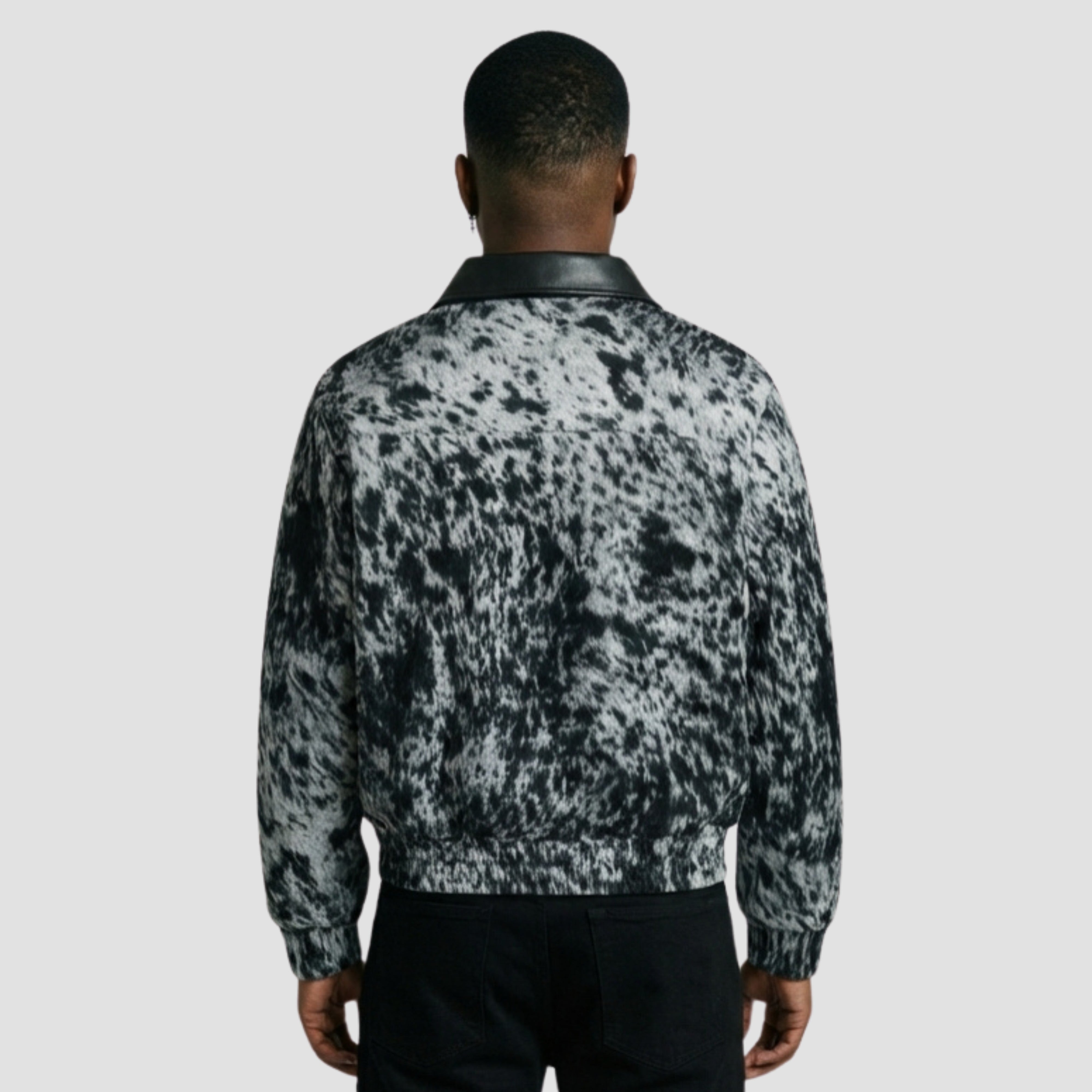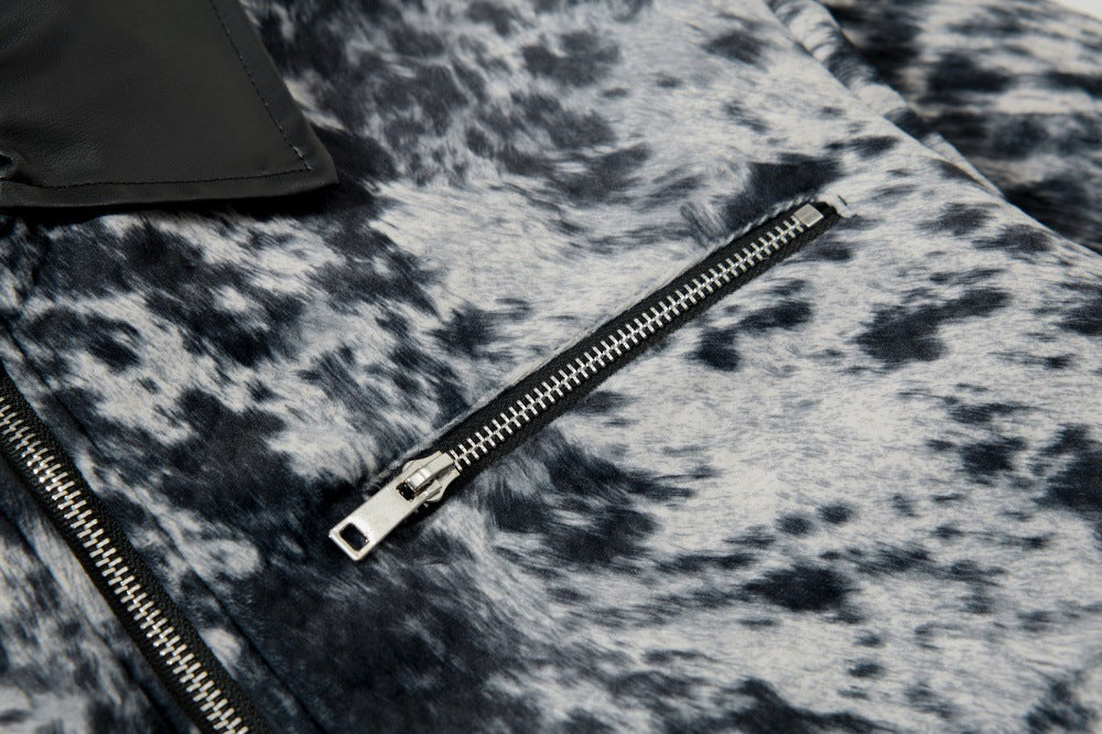 Ink-splash detailing and tie-dye craftsmanship add a raw, artistic dimension to the leopard pattern, while high colour fastness ensures the bold print stays vivid and deep over time. Inlaid pockets and a zipper-front closure keep the functional details clean and minimal. Available in Black, pair with understated bottoms and let the Spencer command the outfit.