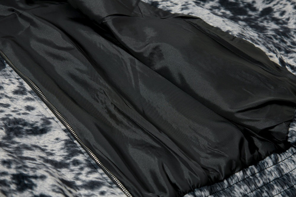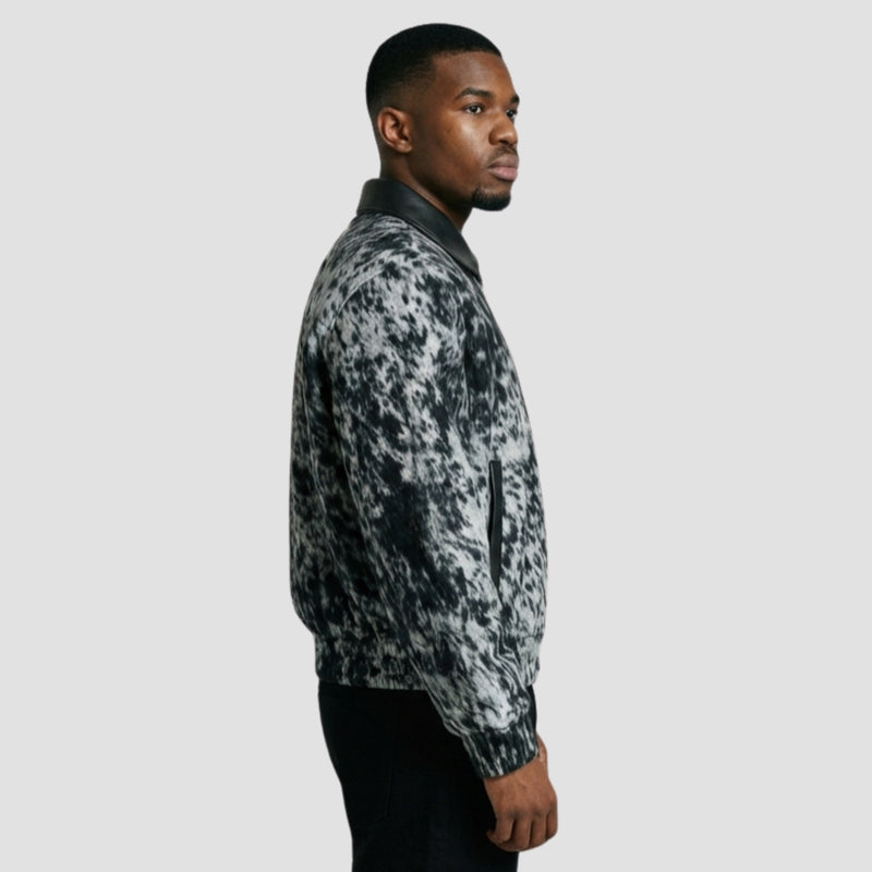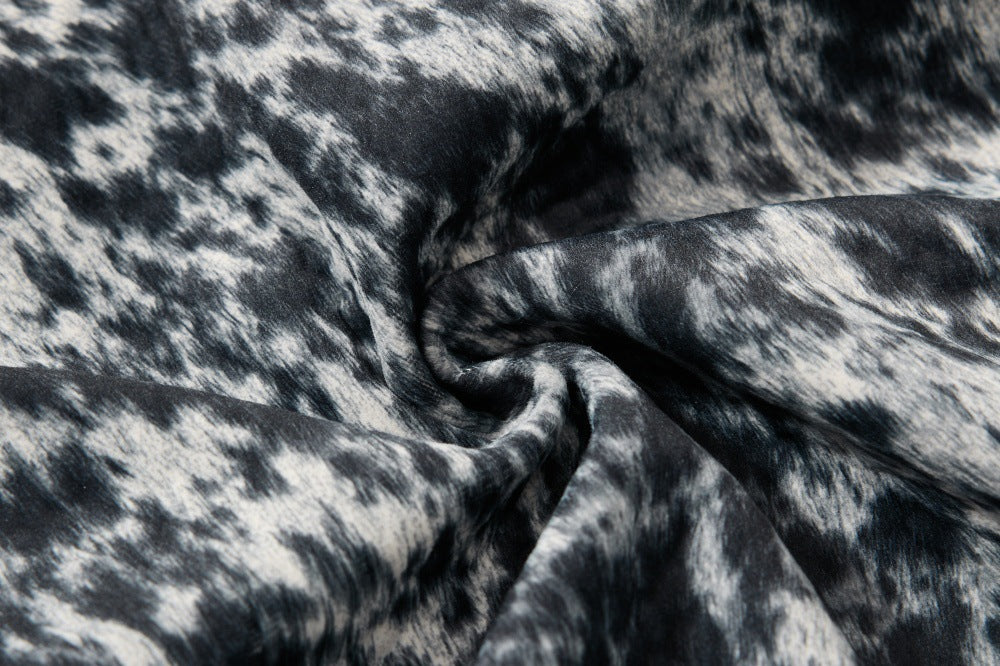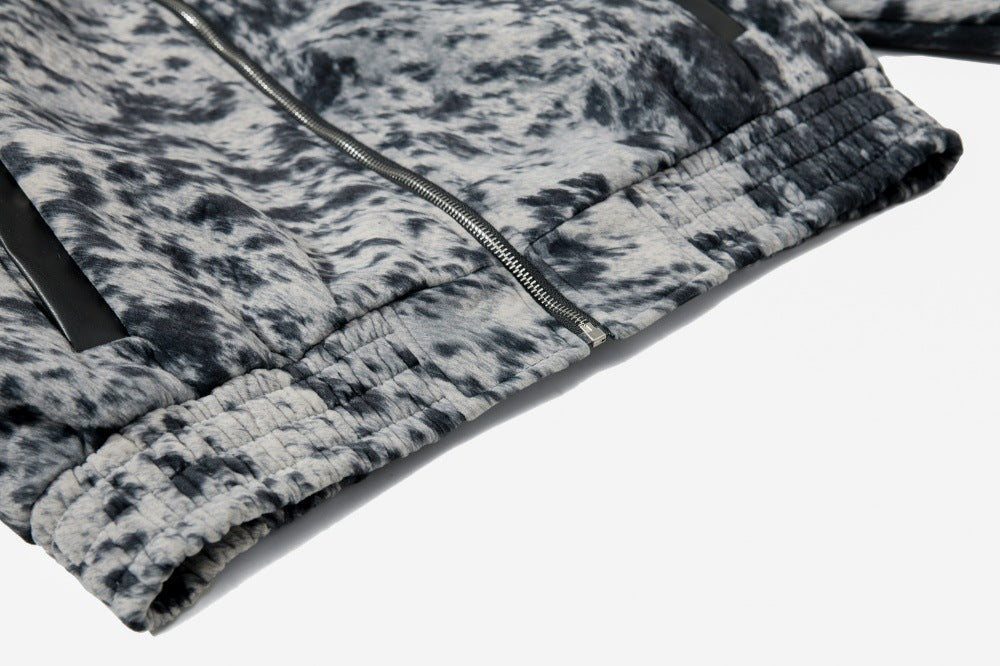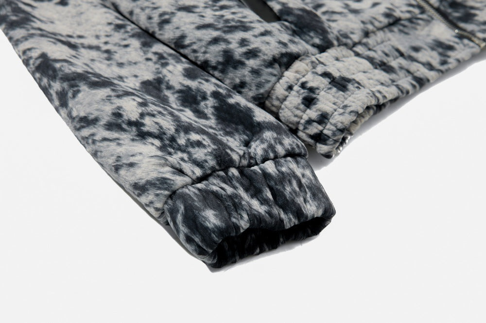 Ink-splash detailing and tie-dye craftsmanship add a raw, artistic dimension to the leopard pattern, while high colour fastness ensures the bold print stays vivid and deep over time. Inlaid pockets and a zipper-front closure keep the functional details clean and minimal. Available in Black, pair with understated bottoms and let the Spencer command the outfit.