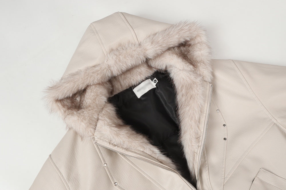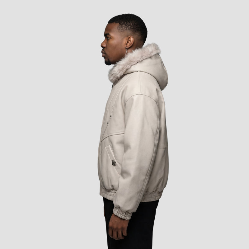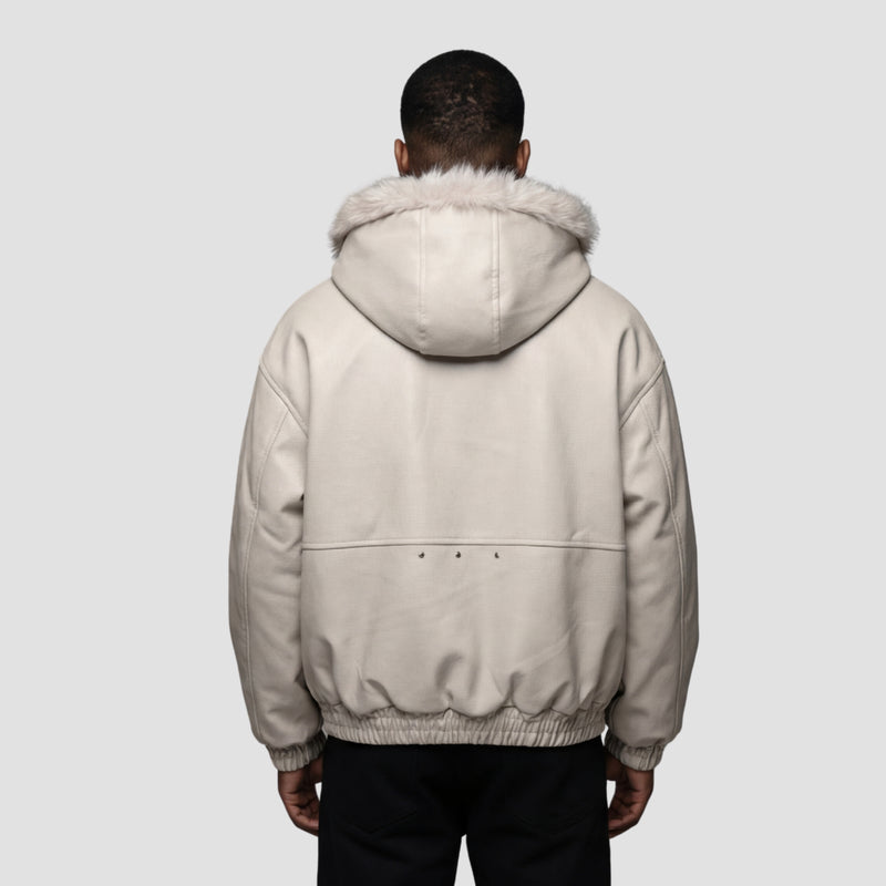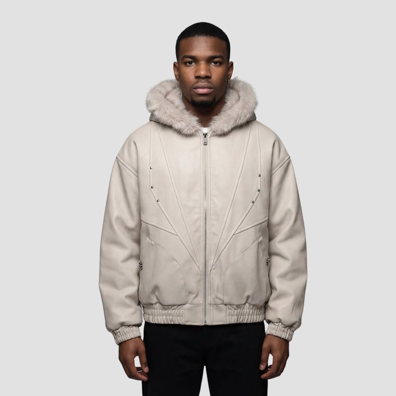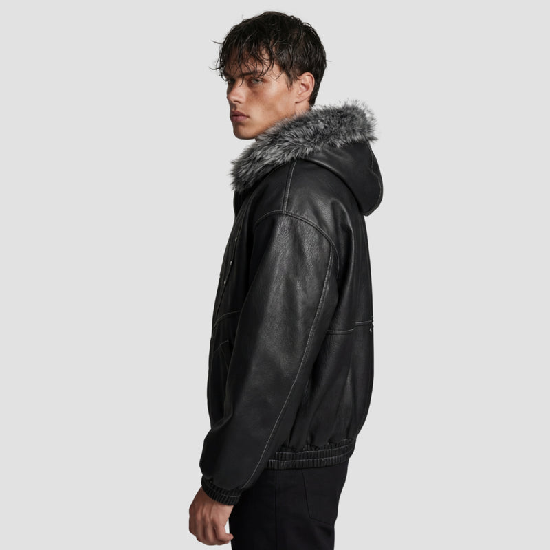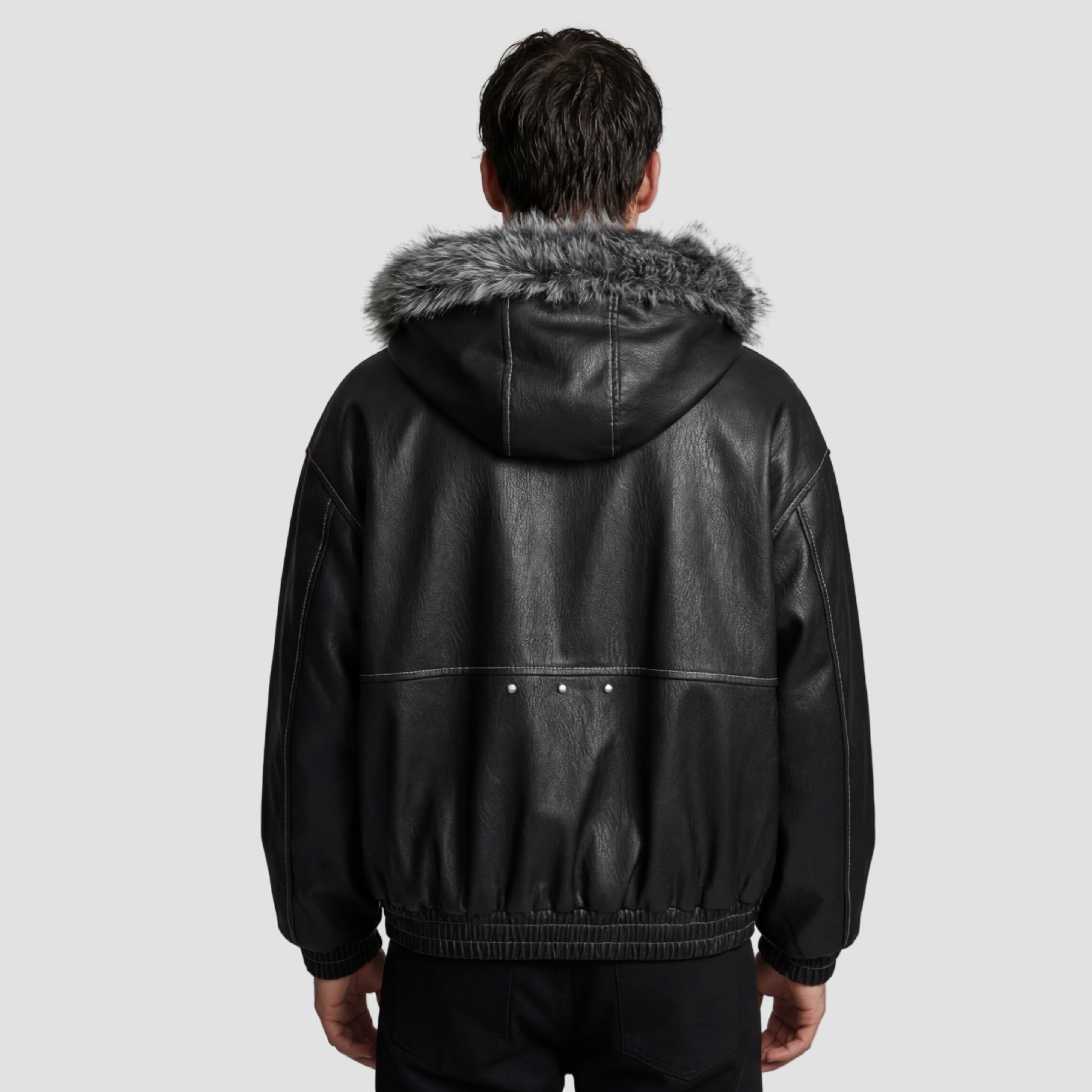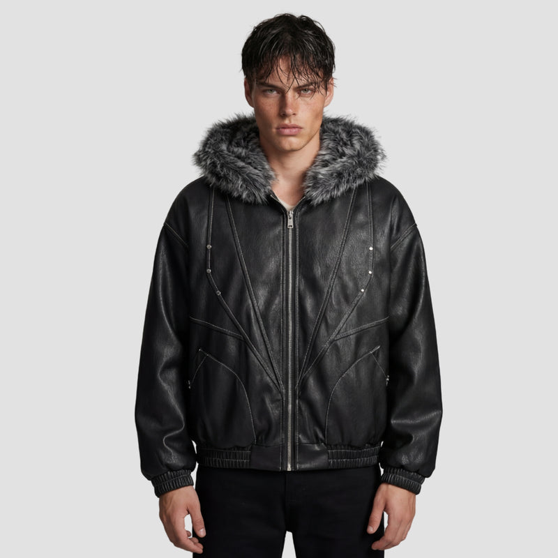 Premium PU leather meets a fur-lined hooded construction in the Stan, a padded winter jacket that balances luxury detailing with street-ready attitude. Built from a polyester-blend PU outer with a full polyester lining and fill, it delivers reliable warmth in a sleek, structured silhouette. The loose fit and hooded design create a relaxed yet imposing profile.