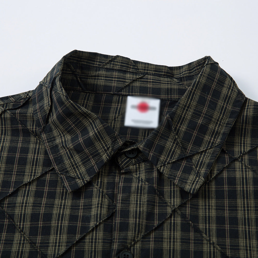 A built-in layered design gives the Kane a fake two-piece aesthetic short plaid sleeves over contrasting long sleeves for a spliced, streetwear-forward look without the bulk. The collage and splicing craftsmanship adds visual depth to the grid pattern, while the no-iron cotton construction keeps things low-maintenance. Available in green, pair with dark trousers and boots for a grounded, transitional look through spring and autumn.
