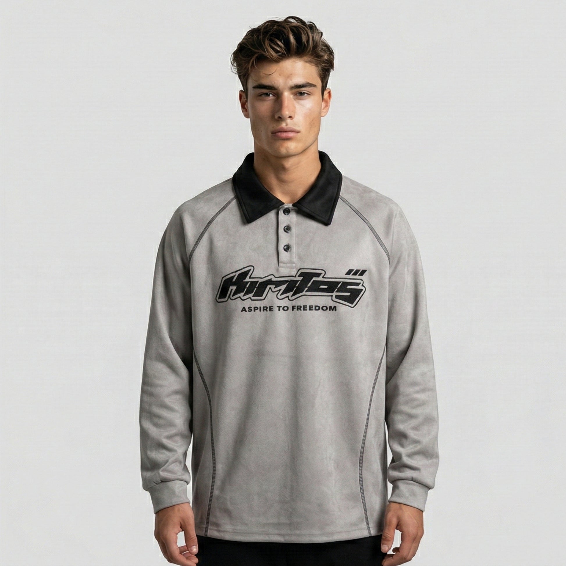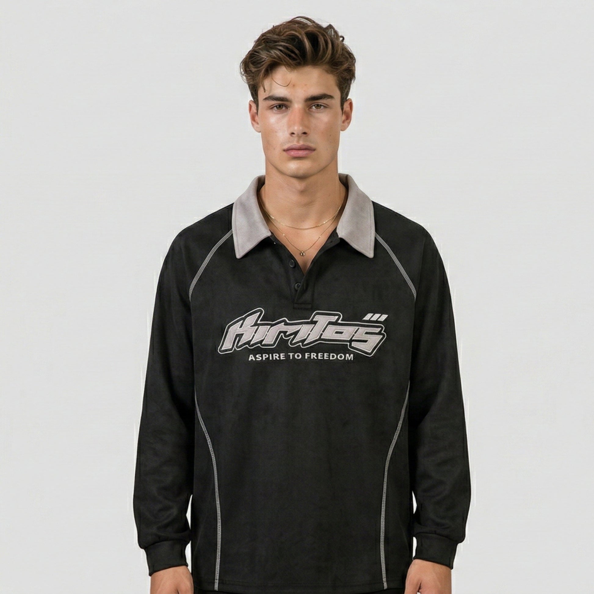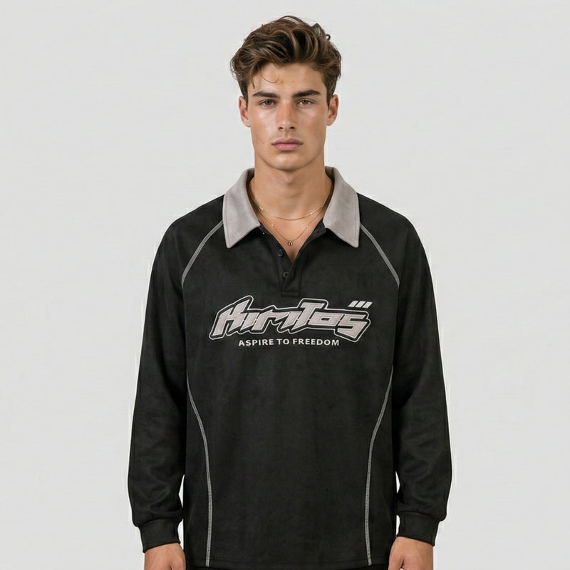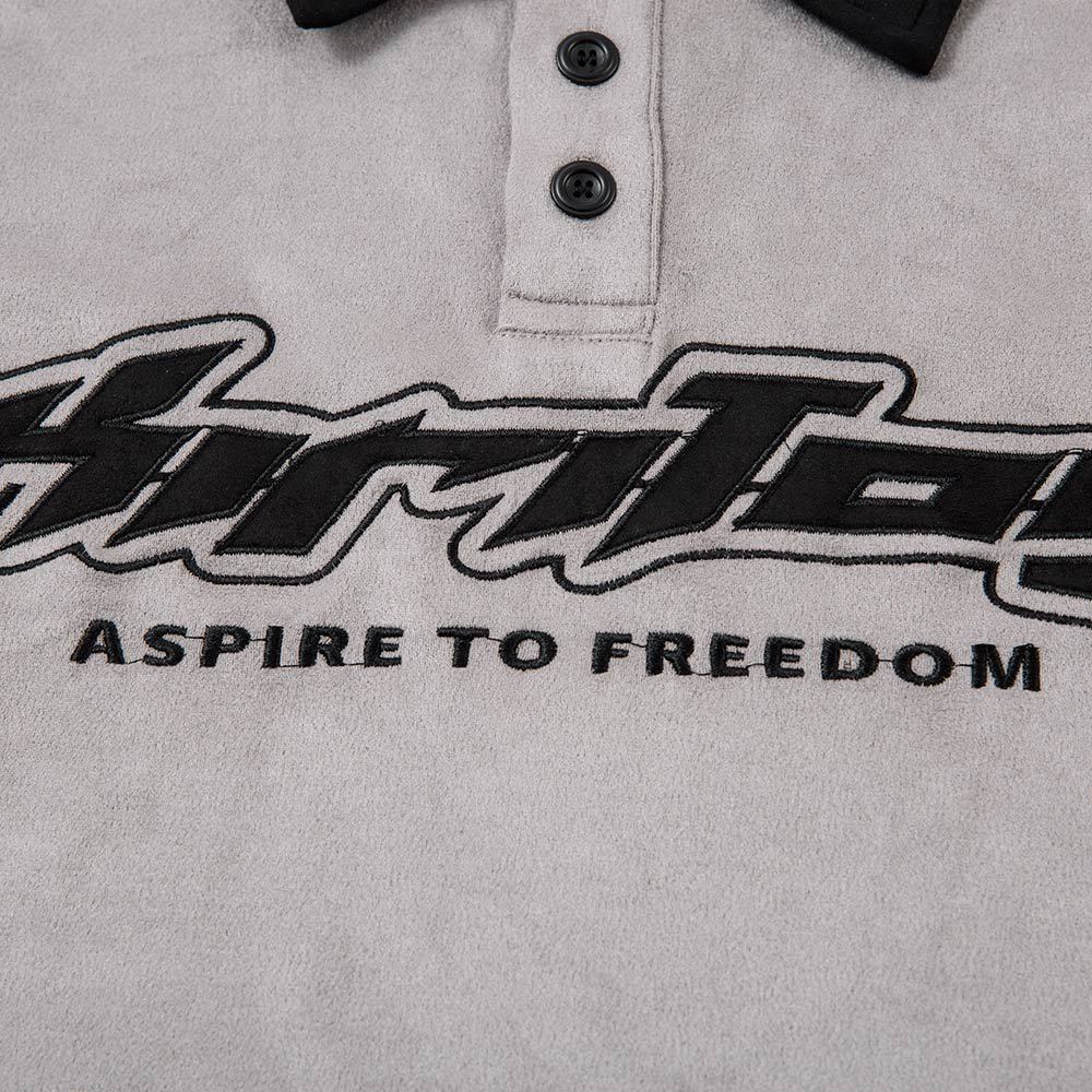 Asymmetrical construction brings modern edge to classic polo silhouette. Embroidery craftsmanship adds artisanal detail that feels premium without overwhelming. Available in Black and Gray, this piece works as a standalone statement or layered under heavier pieces. Pair with relaxed bottoms and clean trainers for a polished, contemporary street look.