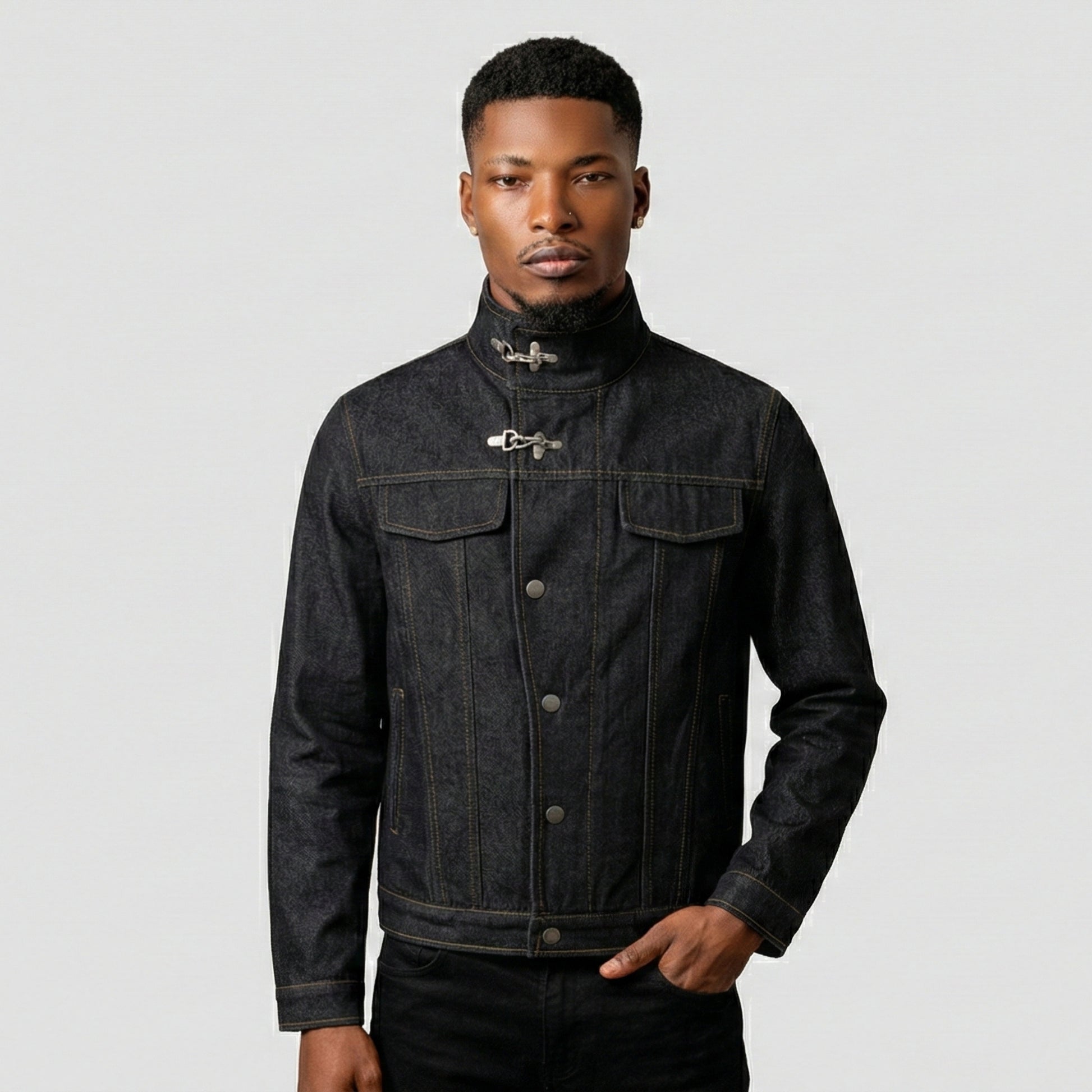 A mid-length construction provides balanced coverage for layering or standalone wear. Available in Black, this jacket pairs with cargo trousers and boots for a commanding, contemporary street statement.