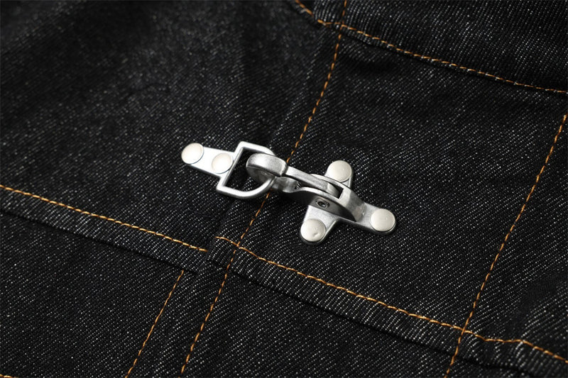Metal decoration adds tactile, functional detailing that catches light and creates visual interest across the chest panel.