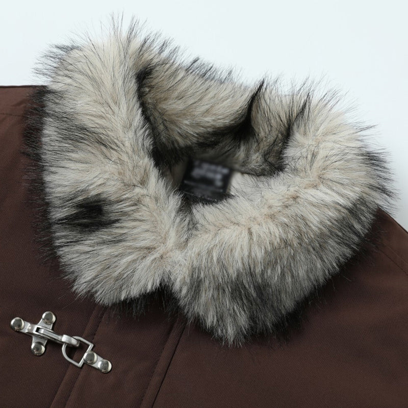 The loose fit and stand collar create a structured profile perfect for winter styling.
