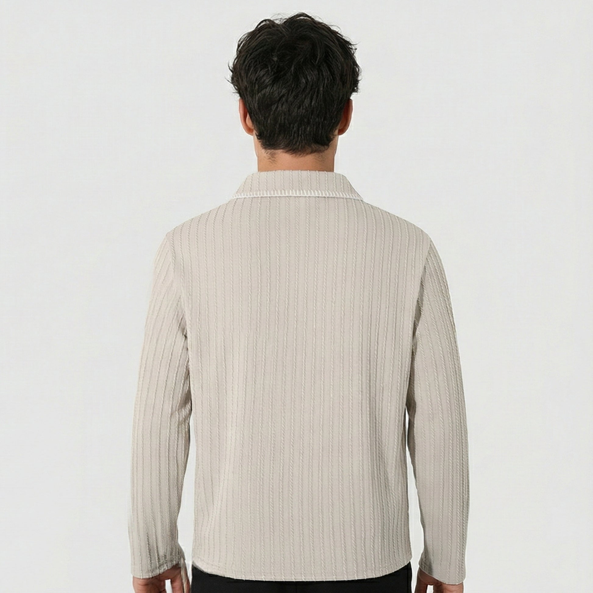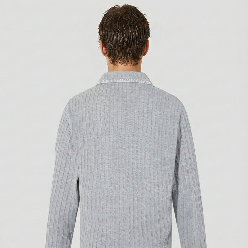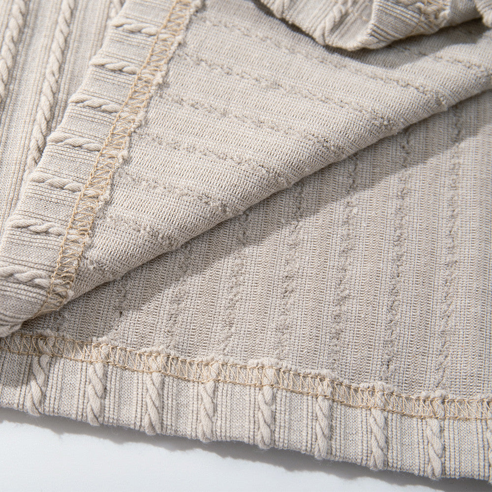 Ribbed hem detailing adds subtle texture without feeling overstated. The no-iron treatment keeps the design accessible without demanding extra care. Available in Black, Apricot, and Floral Gray, this piece brings versatile material interest. Pair with relaxed bottoms and minimal accessories for a refined, textured street look.