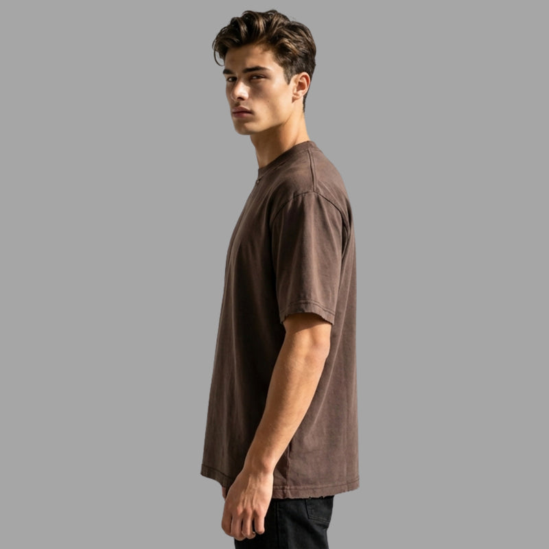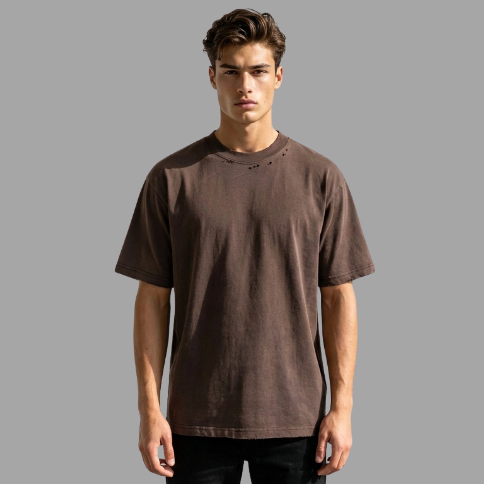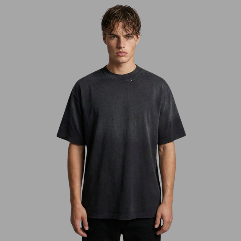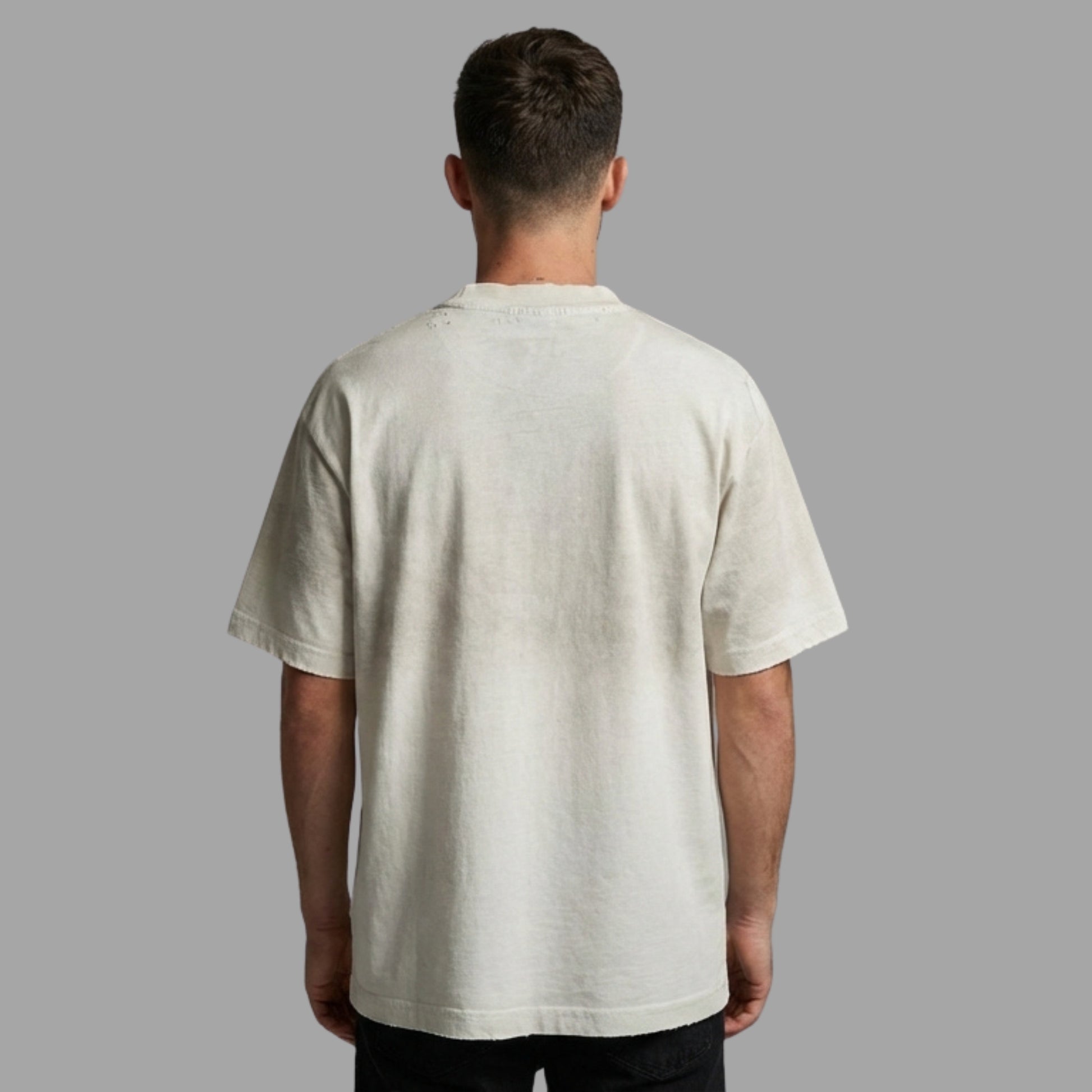 Spray-dyed gradient effects and subtle distressed detailing near the neckline give each piece a raw, lived-in character. The hand-worn craft technique ensures no two pieces feel exactly the same. Available in five colourways, Black, Apricot, and Coffee, the Paul is a summer rotation essential. Pair with dark bottoms and minimal accessories for a grounded, street-ready look.